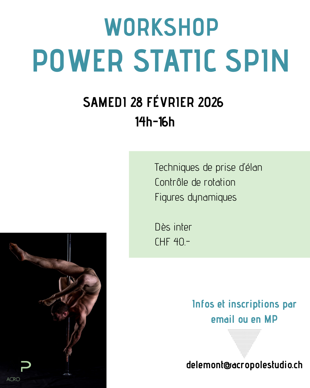 📅 Samedi 28 février 2026 🕑 14h – 16h Workshop axé sur la puissance et le contrôle : techniques de prise d’élan, gestion de la rotation et figures dynamiques. 👉 Niveau : dès intermédiaire 💰 Tarif : CHF 40.– 🎉 Early bird : CHF 30.– jusqu’au 08.02.2026 📩 Inscriptions via Sportsnow, par email ou en MP ✉️ delemont@acropolestudio.ch