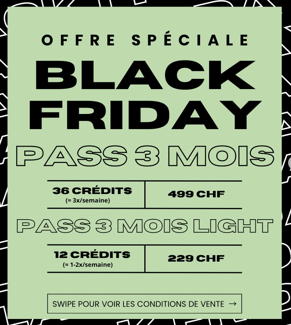 Notre offre est là et elle est unique ! Spécialement pensée pour le Black Friday, elle ne reviendra pas de sitôt alors ne la loupe pas ! Pass 3 mois - 36 crédits pour 499 CHF seulement soit 13,80 CHF/cours ! Pass 3 mois light - 12 crédits pour 229 CHF seulement soit 19 CHF/cours ! Vendus uniquement entre le 22 novembre et le 1er décembre 2025. Active-le à la date de ton choix, au plus tard au 31 mars 2026. Paiement par virement bancaire ou twint (pas de carte de crédit). Non cumulable avec les réductions Jeunes, Etudiants, AVS-AI-AC.
