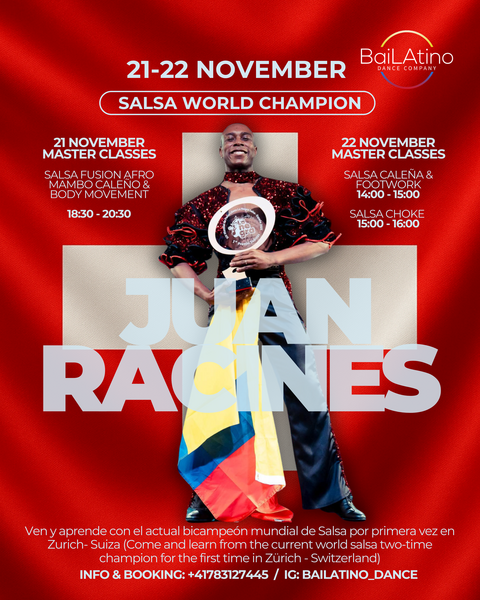 | Juan Racines Workshop (22 November) Salsa Caleña Footwork & Salsa choke | 50.00 CHF | 23.11.2025 | 1 |
