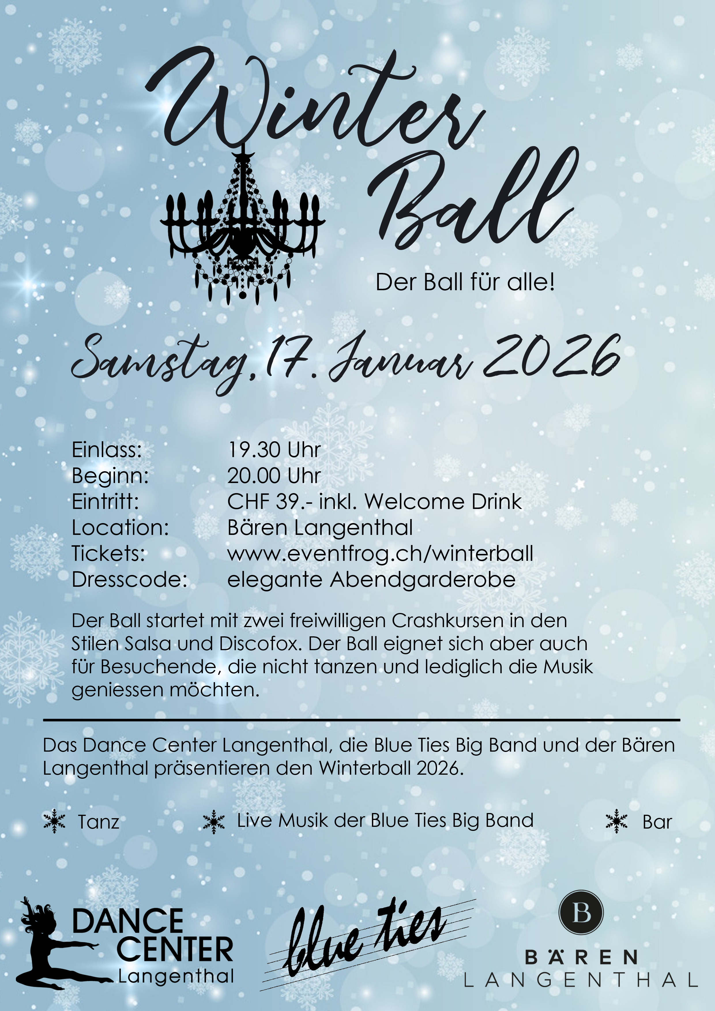 Das Dance Center, die Blue Ties Big Band und der Bären Langenthal präsentieren den Winterball 2026.