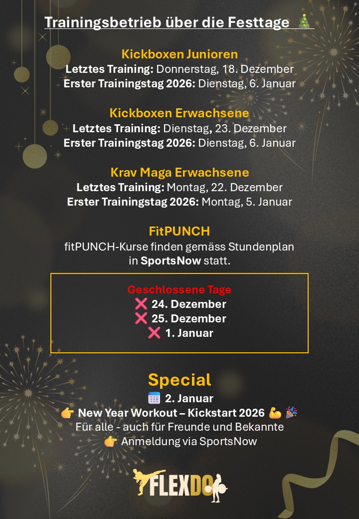 Alle Infos zum Trainingsbetrieb über die Festtage inkl. letzter Trainings, Neustart 2026, geschlossenen Tagen sowie dem Special am 2. Januar findet ihr im Bild oben 🎅💪