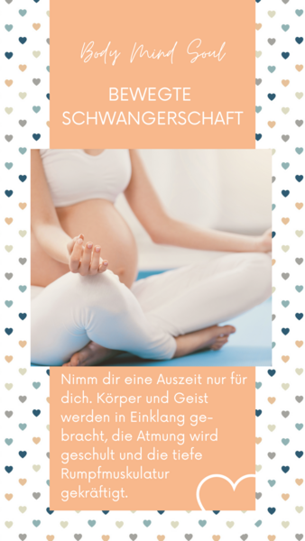 Pilate ist eine Methode, deren Ausführung sich während diesen speziellen neun Monaten besonders eignet und die mehr zu bieten hat als nur körperliches Training. Körper und Geist werden in Einklang gebracht, so bleibst Du beweglich, kräftig und gesund. Die Atmung wird geschult und die tiefe Rumpfmuskulatur gekräftigt.