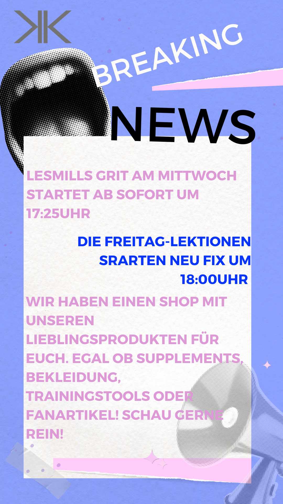 NEWS im MÄRZ Kursplan-Änderungen Mittwoch: Das Training LesMills GRIT startet ab sofort bereits um 17:25 Uhr. Freitag: Die Lektionen am Freitag beginnen neu fix um 18:00 Uhr. Neuer Shop Es gibt nun einen eigenen Shop mit einer Auswahl an Lieblingsprodukten. Das Sortiment umfasst: Supplements & Nahrungsergänzung Bekleidung & Fanartikel Trainingstools Vorbeischauen lohnt sich!