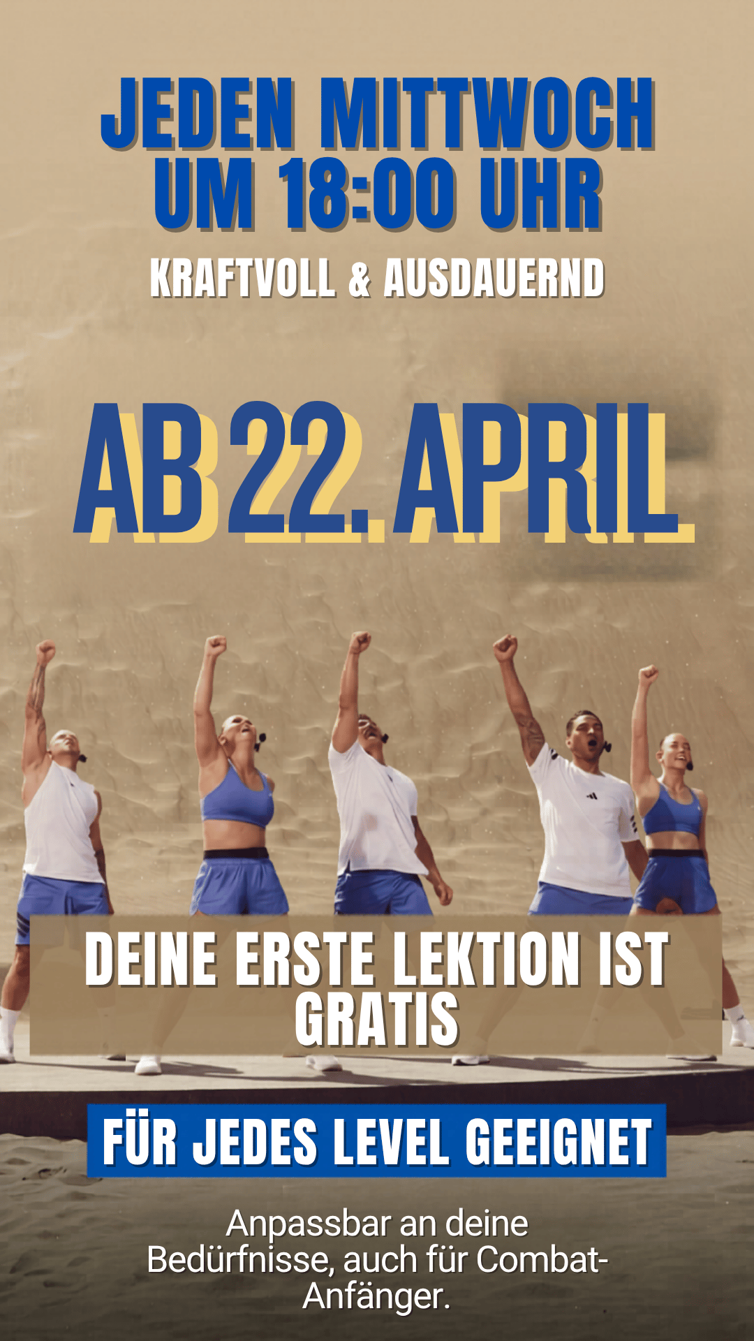 Es ist so weit! Ab dem 22. April bringen wir dein Training auf das nächste Level und ergänzen unseren Stundenplan mit LES MILLS BODYCOMBAT. Um diesen Start gemeinsam zu feiern und dir den Einstieg so einfach wie möglich zu machen, ist die allererste Lektion für alle kostenlos! Dabei spielt es überhaupt keine Rolle, welches Abo du aktuell besitzt – du bist herzlich eingeladen, dabei zu sein. Wie melde ich mich an? Du kannst dir deinen Platz ab sofort und ganz einfach hier über SportsNow sichern. Buche dich dafür einfach in die Klasse "Free-Class LesMills Bodycombat" ein. Du hast noch nie Kampfsport gemacht? Keine Sorge! Wir wissen, dass neue Workouts manchmal etwas Respekt einflössen. Deshalb starten wir zu Beginn der Stunde mit kurzen, gezielten Technik-Inputs. Wir schauen uns die wichtigsten Bewegungen gemeinsam an, damit allfällige Unsicherheiten sofort verschwinden und du mit einem sicheren Gefühl starten kannst. Du wirst sehen: Das Training ist ein absolutes Erlebnis! Und vergiss nicht: Du kannst nicht verlieren – entweder du gewinnst oder du hast etwas Neues dazugelernt. Warum BODYCOMBAT? Die Vorteile auf einen Blick: Dieses Workout passt perfekt zu unserem Ziel, den Körper und den Stoffwechsel nachhaltig zu stärken: Der ultimative Stoffwechsel-Boost: Das intensive Cardio-Training bringt deinen Puls nach oben, kurbelt die Verbrennung an und hält deinen Stoffwechsel aktiv. Kraft für den ganzen Körper: Wir stärken nicht nur Beine, Arme und Schultern, sondern trainieren bei jeder Rotation intensiv deine Rumpfmuskulatur (Core). Kopf frei, Stress weg: Es gibt kaum ein besseres Training, um nach einem langen Tag den Kopf komplett freizubekommen. Anpassbar an dein Level: Du bestimmst deine eigene Intensität. Egal, ob du Einsteiger bist oder schon lange trainierst, die Übungen lassen sich an deine Bedürfnisse anpassen. Sichere dir jetzt deinen Platz in der Free-Class LesMills Bodycombat und lass uns gemeinsam schwitzen. Ich freue mich auf dich!
