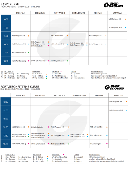 Seit dem 1. Dezember kann man sich für die Semesterkurse im Frühlingssemester 2026 anmelden. Die gewünschten Abos und die dazugehörigen Kurse könnt ihr wie gewohnt über SportsNow buchen. Der Stundenplan für die Basic und die Fortgeschrittenen Kurse sind auf dem Bild ersichtlich. Bei Fragen könnt ihr euch gerne an folgende Mailadresse melden: kurse@overground.ch