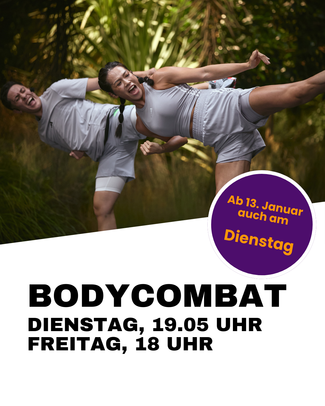 Ab 13. Januar gibt es neu ein BODYCOMBAT um 19.05 Uhr mit Fabienne. Beim BODYCOMBAT-Workout schlägst und kickst du dich fit und verbrennst dabei viele Kalorien. Du baust Stress ab, hast eine Menge Spass und fühlst dich am Ende fantastisch! Melde dich jetzt an!