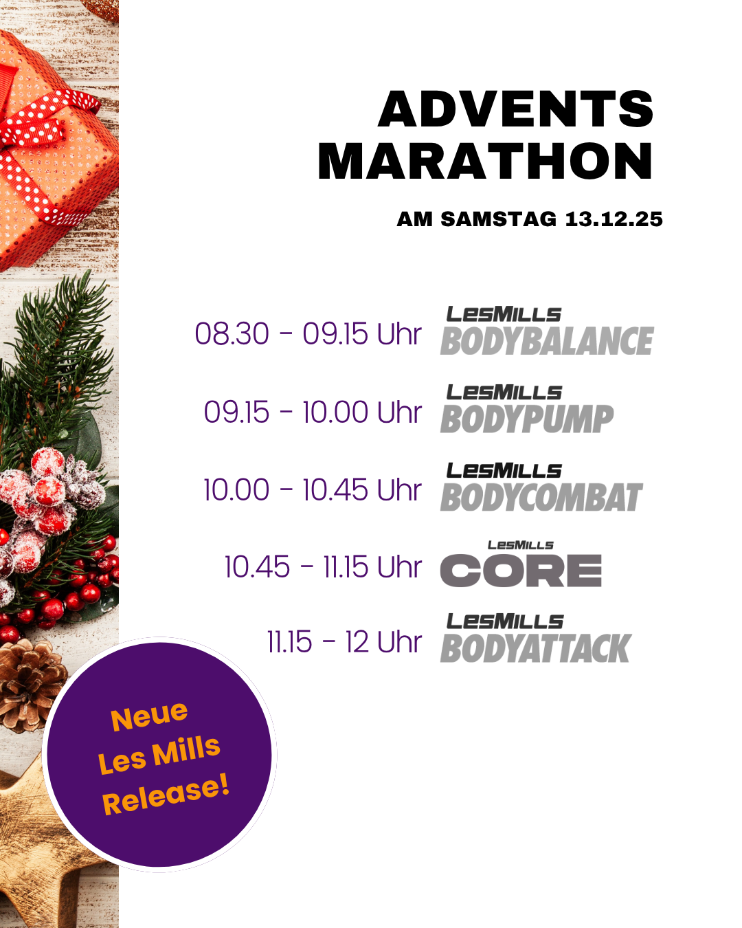 Am 13. Dezember findet unser Adventsmarathon statt! Die Kurse sind an diesem Tag kostenlos, wir sammeln für die Glückskette. Wir freuen uns auf euch!